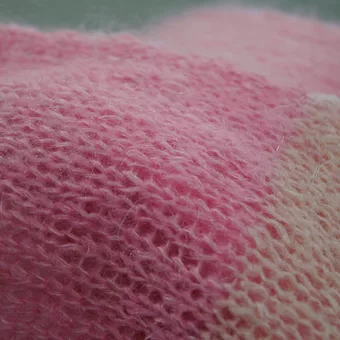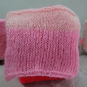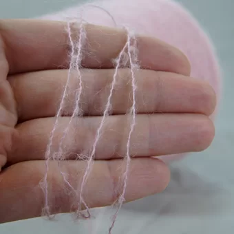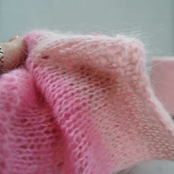 Пряжа пушистая, тактильно приятная, мягкая. Мой образец связан в 2 сложения на спицах № 5,5. Образец размером 17,5 см*17,5 см весит 6 гр.