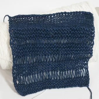 Мой образец связан в 2 сложений (исходный метраж 330 м/100 гр) на спицах № 3. Образец размером 11 см*11 см весит 7 гр.