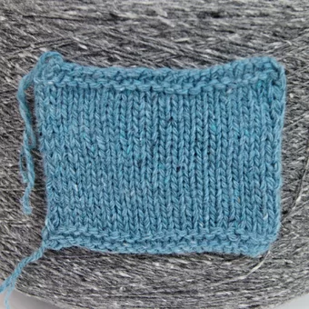 Мой образец в темно-голубом цвете (6409) связан в 3 сложения на спицах № 4,5. Образец размером 11 см *8 см весит 5 гр.